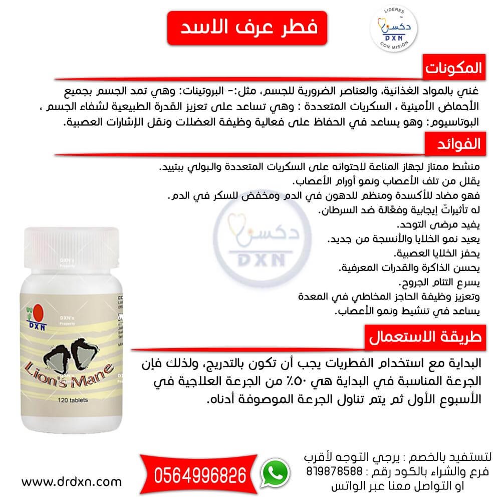 فطر عرف الاسد : مكمل غذائي من أقوى الفطريات في العالم وهو غذاءٌ لذيذ الطعم، ويسمى بمقوي الأعصاب الذي يساعد في تحسين الهضم والنشاط العام للجسم، وهو الاختيار الأمثل لمن يعانون من الآلام المعوية
